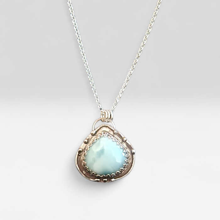 Found only in the Caribbean, larimar is deeply connected to oceanic energy and emotional calm. Its soft blues and natural marbling evoke water, sky, and breath, a visual pause in solid form.
