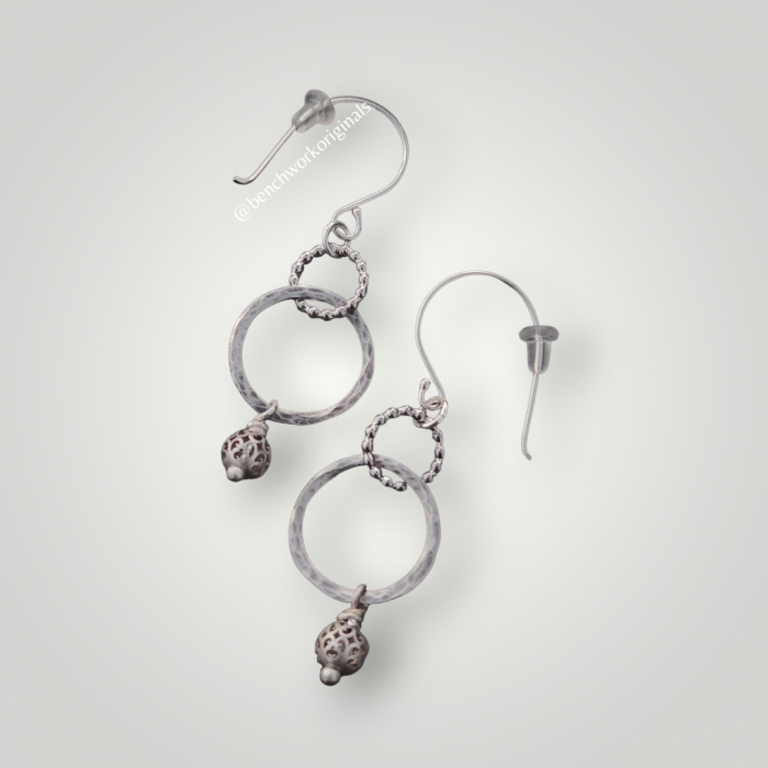 These handccrafted sterling silver earrings combine hammered hoops, a braided silver rings and a delicate filigree ball for a textured boho-inspired design. Measuring approximately 2" long, they're lightweight, stylish and ideal for anyone searching for unique artisan earrings for everyday.