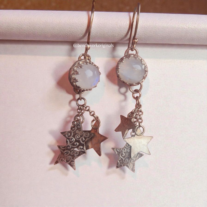 Rainbow moonstones shine bright atop a trail of three textured sterling silver stars. These handcrafted earrings are approximately 2" long and lightweight. These earrings are for the free-spirited woman who enjoys eye-catching movement with the turn of a head.