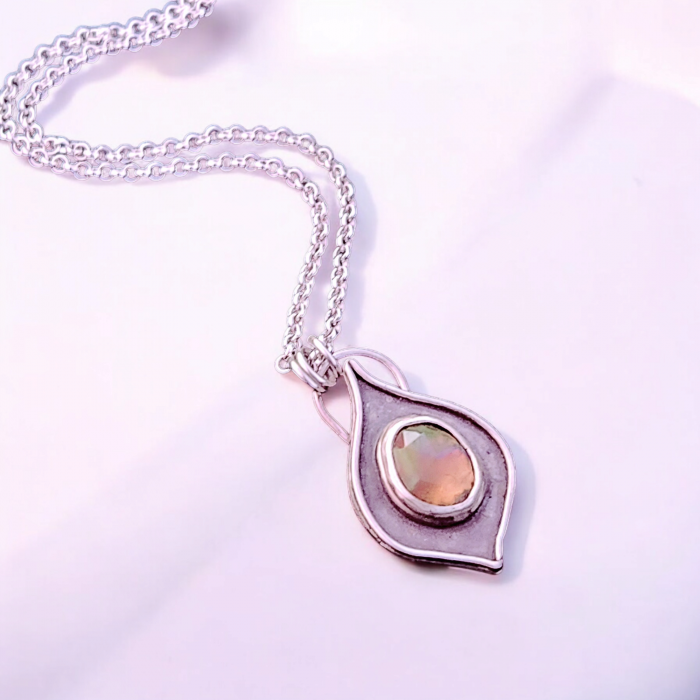 Lime green, crimson red, and golden hues dance across the facets of this rosecut Ethiopian opal, simply set within a sterling silver step bezel and encircled by a sterling silver wire. The pendant has an overall height of approximately one inch and a width just over half an inch. It dangles from an 18-inch sterling silver rolo chain.